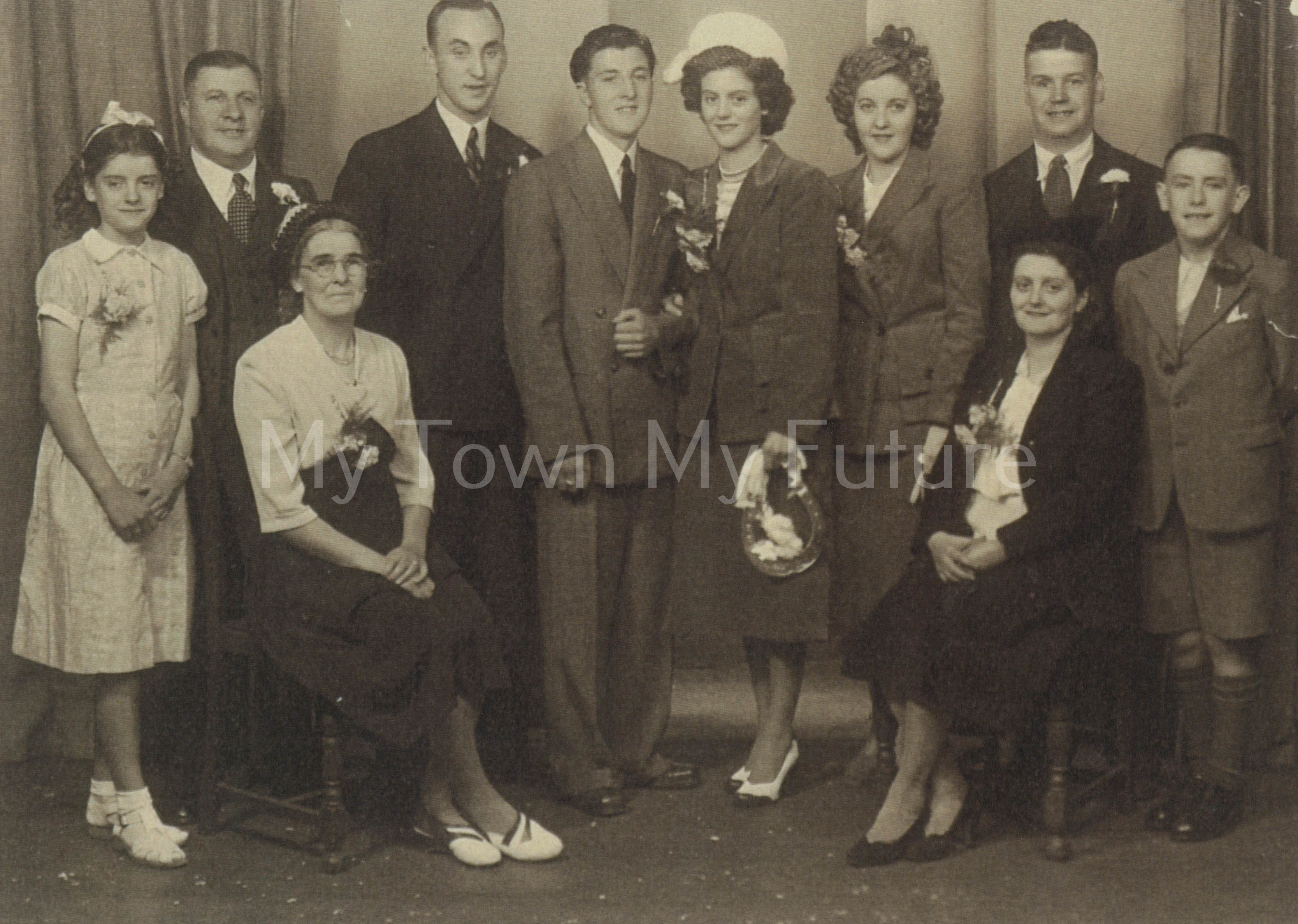 Back row left to right: Lilian Robinson; Joseph Robinson, bridegroom’s father; unknown – hidden man; lady behind – unknown; grandfather, Giovanni Yafano, bride’s father; unknown; bridesmaid, Maureen Johnson, bride’s best friend; Edna Robinson, bridegroom’s sister; Margaret Robinson, bridegroom’s mother.